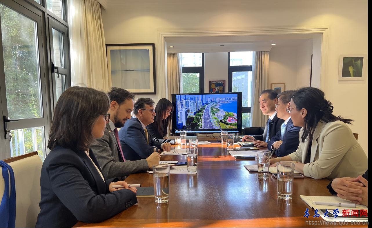 魏志强代表学校向阿尼瓦尔·卡夫拉尔出任驻华大使表示热烈祝贺,并简要地介绍了学校的办学特色和专业优势。他表示,拉美地区是学校国际交流合作最重要的区域之一,与乌拉圭共和国大学的合作,是其中的标杆和典范。两校共建的孔子学院架起了两国文明互鉴的桥梁,已经成为当地传播汉语言文化极具影响力的窗口。生物纳米制药实验室和中国-乌拉圭研究中心写入了两国元首联合声明,目前进展良好,已经取得阶段性成果。他说,下一步,两校将继续以孔子学院建设为基础,加强人才培养合作和人文交流,发挥两校学科优势,进一步拓展科研合作,同时结合青岛市的产业优势,联合山东港口集团、海信、海尔、青啤等国际知名企业,做好产学研转化,服务乌拉圭当地经济和社会发展。