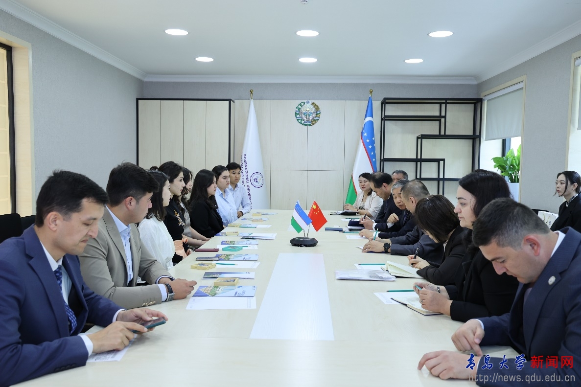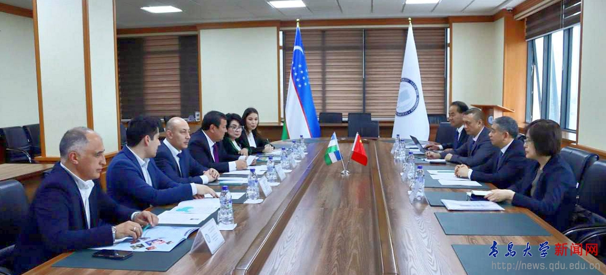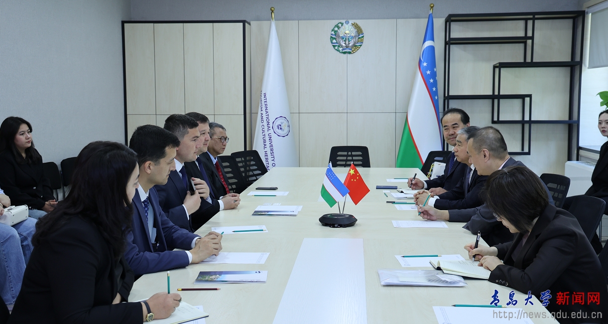 4月19日晚和20日上午,代表团分别与乌兹别克斯坦“丝绸之路”国际旅游与文化遗产大学执行校长穆赫辛忠・霍尔穆哈梅多夫和第一副校长迪尔穆罗德·纳西莫夫进行了工作会谈。双方回顾总结了两校合作情况,认为自2024年两校建立友好关系以来合作不断深入,校级工作团组实现互访,服务于“山东之窗”建设,两校已有14名学生到对方学校交流学习。双方同意进一步拓展教师互访,加强生态旅游科研合作及书法语言等文化交流,优化课程与学分设置,推动更多学生双向流动。该校由乌总统沙夫卡特·米尔济约耶夫于2018年在青岛参加上海合作组织峰会期间发起设立,是乌兹别克斯坦第一所具有国际地位的国立大学,校内设有联合国世界旅游组织撒马尔罕旅游学院。