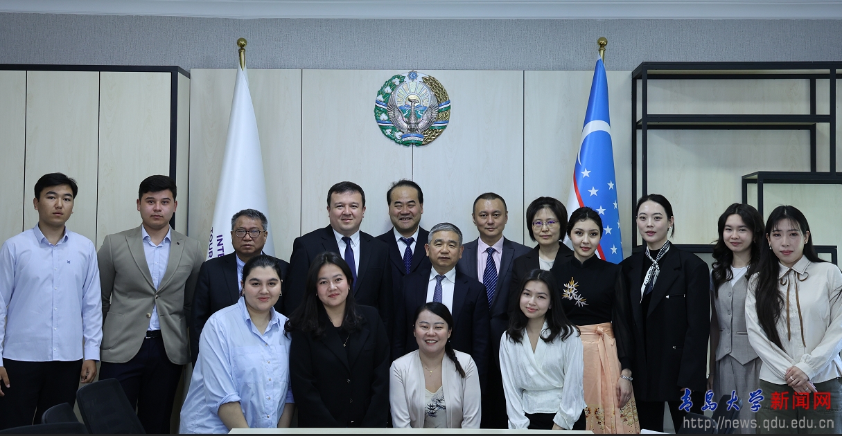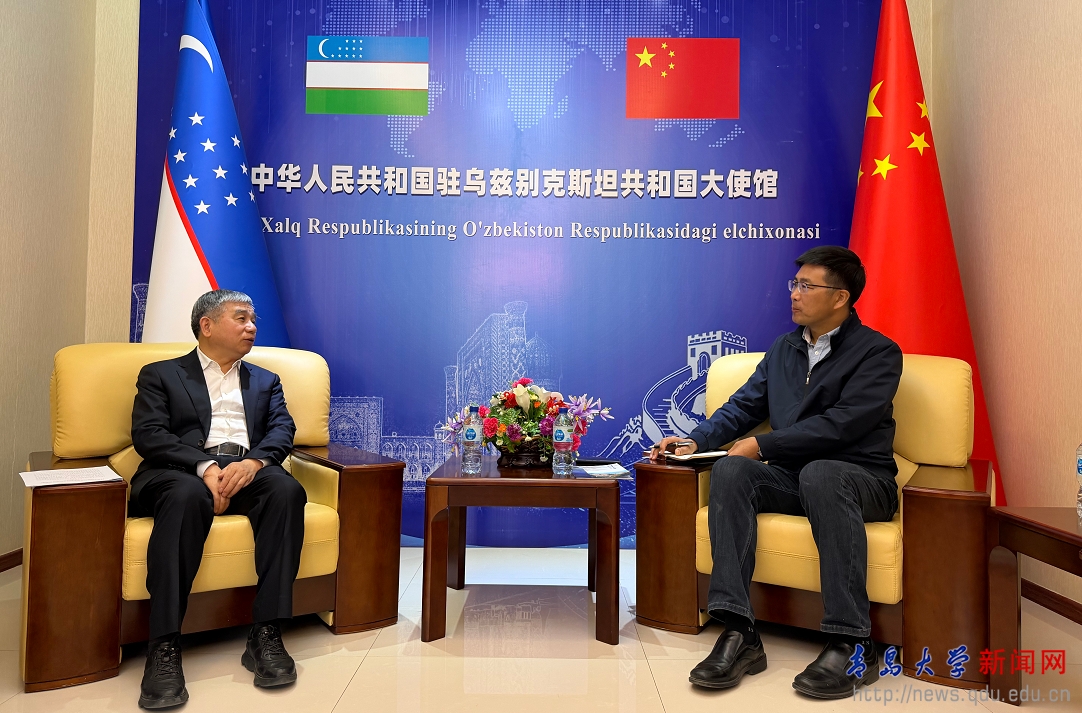 4月21日上午,代表团拜会了中国驻乌兹别克斯坦大使馆,与教育参赞孙长栋进行了工作会谈。胡金焱介绍了学校发展以及国际化办学情况,表示愿在上合组织框架内与乌兹别克斯坦高校在旅游、纺织、人工智能和国际中文等领域开展务实合作。孙长栋介绍了乌兹别克斯坦当前经济社会、教育政策与高等教育状况,表示愿意积极支持推动青岛大学与乌方高校开展合作。