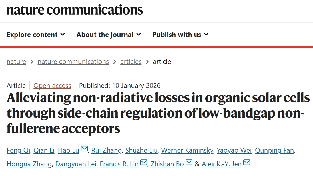 新闻网讯 近日,材料科学与工程学院齐峰副教授、路皓副教授与纺织服装学院薄志山教授,在抑制有机太阳能电池非辐射能量损失的研究领域取得了重大突破性进展,相关成果以“Alleviating non-radiative losses in organic solar cells through side-chain regulation of low-bandgap non-fullerene acceptors”为题在国际顶级学术期刊Nature Communications上发表。青岛大学为第一单位和通讯单位。