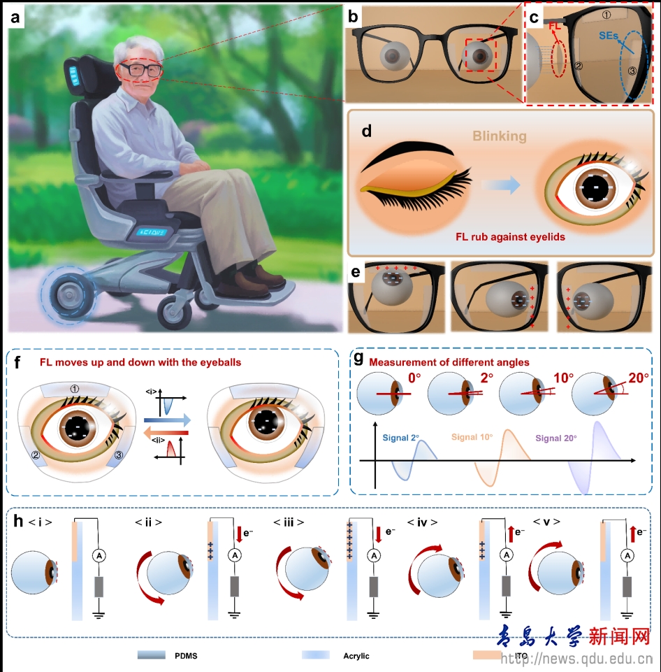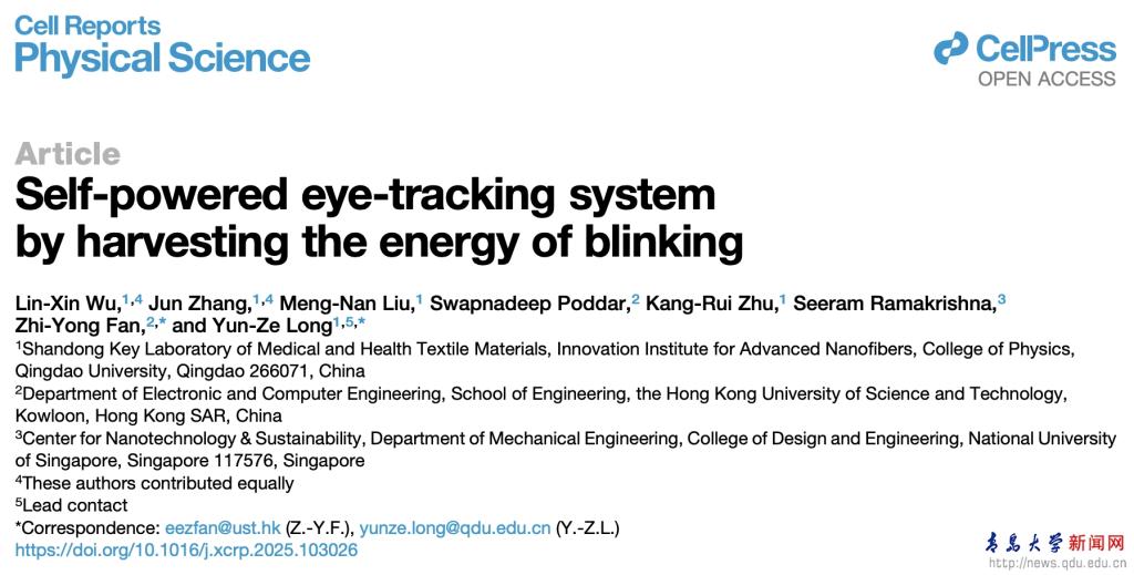 新闻网讯 近日,物理科学学院龙云泽、张俊教授团队跟香港科技大学范智勇教授团队合作,开发了一种基于摩擦电纳米发电机单电极模式下的自供电的眼动追踪系统,渐冻症患者可利用眨眼的能量和眼球运动来控制轮椅的运动,该系统有望彻底改变渐冻症等严重行动障碍人士的辅助技术。该研究以“Self-powered eye-tracking system by harvesting the energy of blinking”(通过利用眨眼产生的能量实现的自供电眼球追踪系统)为题,于2026年1月7日发表在Cell旗下期刊Cell Reports Physical Science上,并被Cell Press头条报道。论文第一作者是物理科学学院硕士研究生吴林鑫和张俊教授,龙云泽教授、香港科技大学范智勇教授为论文共同通讯作者。