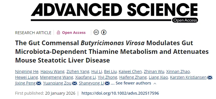 新闻网讯 近日,基础医学院特种医学学科李尚勇、何宁宁团队联合深圳华大生命科学研究院邹远强研究员、Karsten Kristiansen教授、中国水产科学研究院黄海研究所彭吉星副研究员在Advanced Science杂志(中科院一区Top,IF=14.1)发表题目为“The Gut CommensalButyricimonas virosaModulates Gut Microbiota-dependent Thiamine Metabolism and Attenuates Mouse Steatotic Liver Disease”的研究成果,何宁宁副教授、王浩宇(2019级华大基因创新班本科生,现中国科学院大学华大专项硕士研究生在读)、杨子臻(2019级华大基因创新班本科生,现青岛大学生物信息学硕士研究生在读)为该论文并列第一作者。Karsten Kristiansen、彭吉星、邹远强、李尚勇为论文通讯作者,青岛大学基础医学院为第一单位和通讯单位。本研究得到了国家自然科学基金面上项目、山东省青创团队等项目的资助。