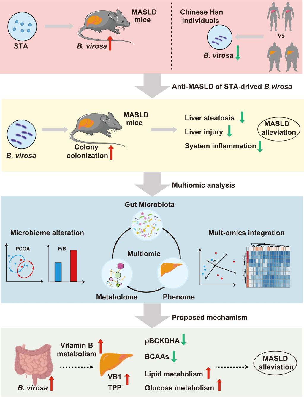 代谢功能障碍相关脂肪性肝病(MASLD)困扰全球约30%人群,可进展为肝纤维化、肝癌等重症,其发病与脂质代谢紊乱、肠道菌群失衡、硫胺素(维生素B1)缺乏密切相关。研究发现,一株新型肠道丁酸单胞菌(B. virosa)可在结肠定植并高效合成硫胺素,经门静脉转运至肝脏后提升焦磷酸硫胺素及pBCKDHA活性,进而加速支链氨基酸降解,抑制高脂饮食小鼠的MASLD进展;进一步研究发现,在硫胺素缺乏饮食条件下补充该菌株也能显著提升肠道单磷酸硫胺素含量,缓解小鼠MASLD症状。
