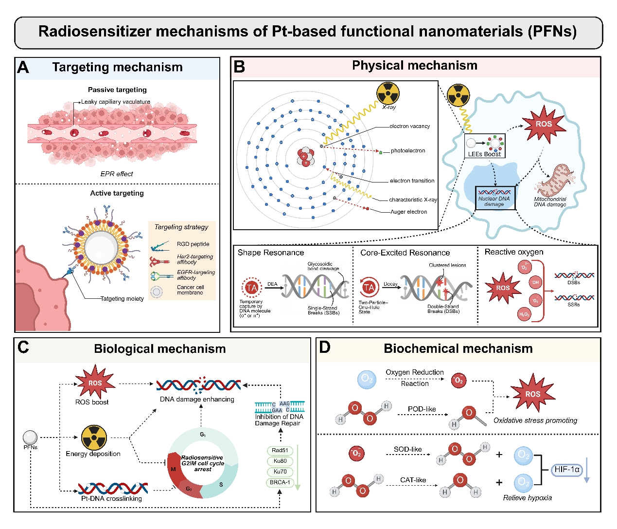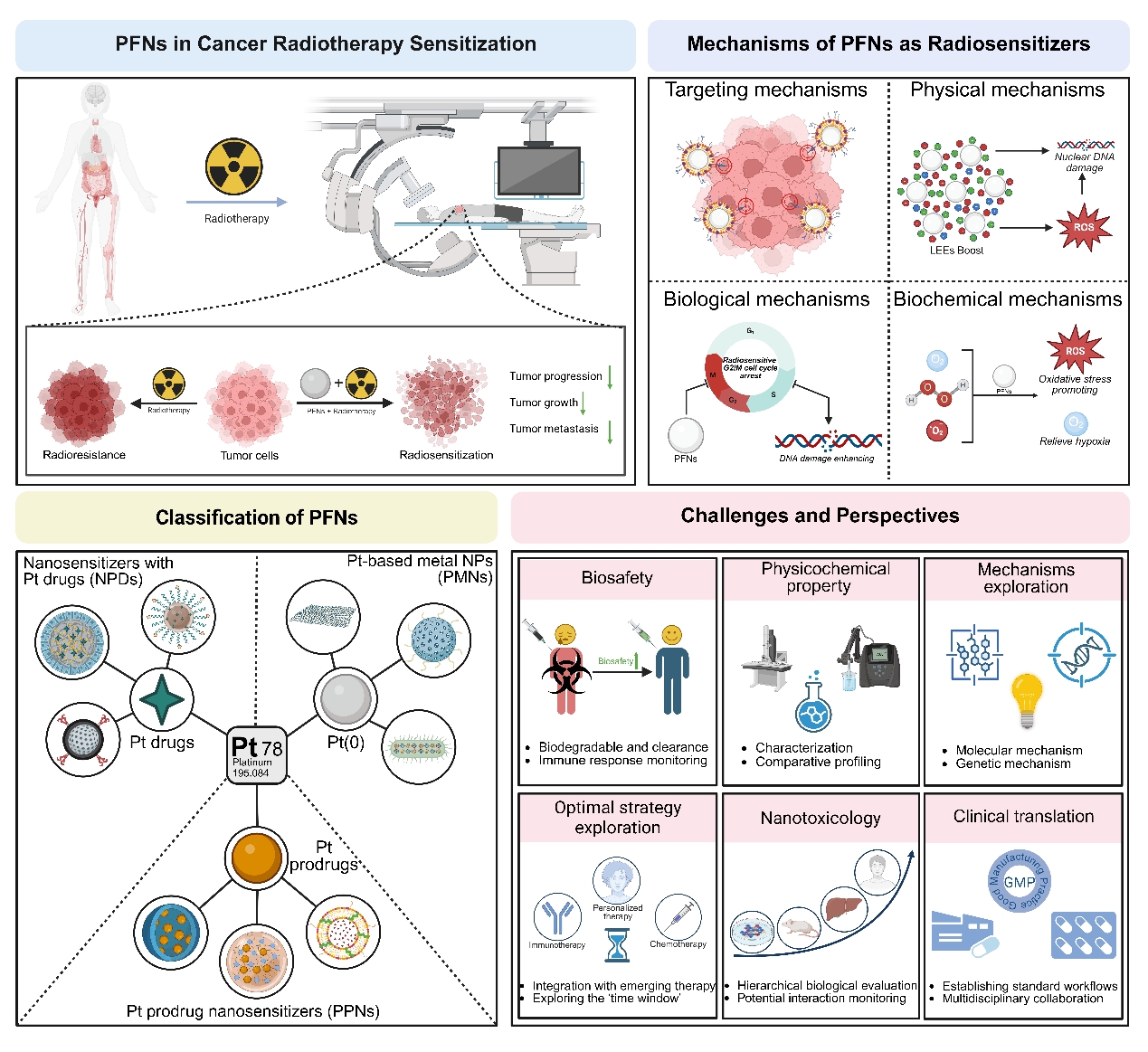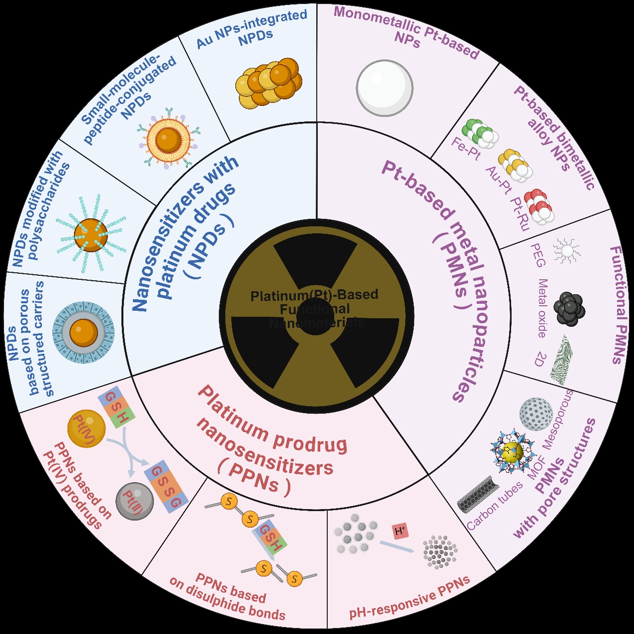 近年来,越来越多的研究证实了铂基功能纳米材料作为放疗增敏剂在肿瘤放射治疗中具有显著的治疗效果。它能够通过高原子序数特性增强辐射能量沉积,还会引发复杂的"辐射-纳米材料-肿瘤微环境"相互作用,这也为提升放疗疗效、降低副作用带来了新的机遇。随着纳米放射生物学的深入研究,铂基功能纳米材料与电离辐射之间的协同作用机制也逐渐被阐明。从物理剂量增强效应到纳米材料介导的放射生物学效应,囊括了氧化应激增强、DNA损伤加剧、肿瘤微环境调控等多个层面,均获得了越来越多的实验证据支持。