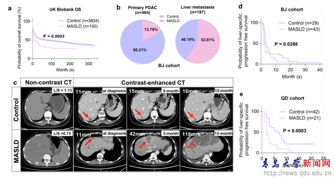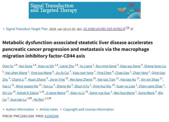新闻网讯 近日,青岛大学附属医院胰腺病诊治中心任贺教授团队联合扬州大学附属医院、北京协和医院、浙江省肿瘤医院等国内知名医学中心,历经五年深耕,在国际顶尖学术期刊《自然·信号转导与靶向治疗》(STTT,影响因子52.7)发表研究成果。青大附院助理研究员于茜,青岛医学院硕士研究生宋辉、博士研究生石晓雅,北京协和医院影像科副主任医师朱亮为共同第一作者。该研究首次系统揭示了脂肪肝为胰腺癌发生肝转移的“背后推手”,彰显了青大附院在肿瘤与代谢性疾病研究领域的国际影响力,为胰腺癌的精准治疗提供了新思路。