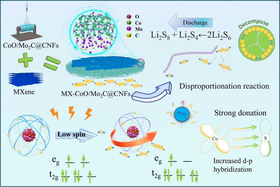 该文设计了一种自支撑MX-CoO/Mo2C@CNFs正极材料,用于缓解锂硫电池的穿梭效应和动力学缓慢问题。通过构建非对称Co-O-Mo键取代Co-O-Co结构,诱导钴位点转变为低自旋态,优化了电子结构并增强了d-p轨道杂化,从而显著提升了多硫化物的吸附与催化转化效率。原位表征揭示了Li2S6的歧化反应路径,低自旋钴活性中心有效抑制了穿梭,增强了高硫载量下的电化学性能。本研究为通过自旋态调控设计高效锂硫电池催化剂提供了新思路。