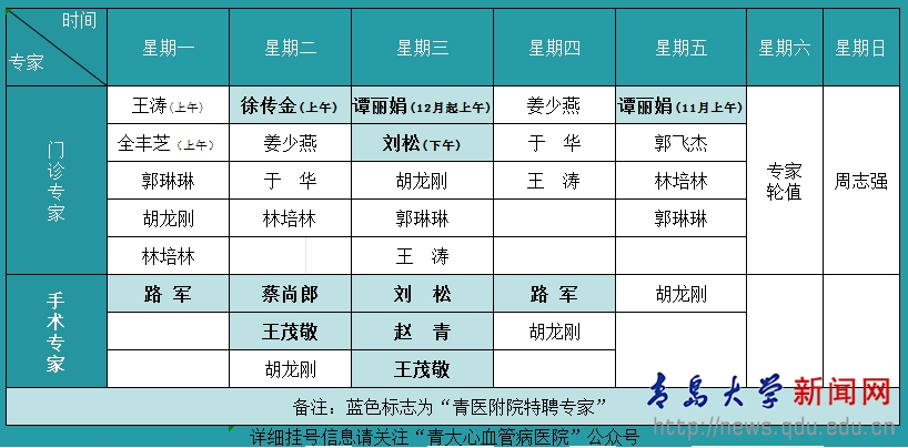 详细专家信息及坐诊、手术时间等信息,见青岛大学附属心血管病医院公众号(青大心血管病医院)及青岛大学附属心血管病医院官网(https://xxg.qdu.edu.cn/index.htm)。