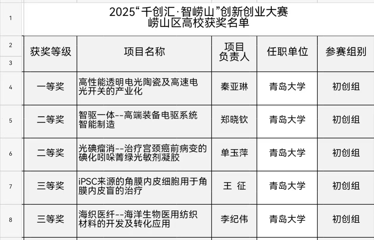 新闻网讯 近日,由崂山区主办的2025“千创汇·智崂山”创新创业大赛圆满落幕。我校在本届大赛中表现亮眼,共有五个项目脱颖而出,分别荣获一等奖1项、二等奖1项、三等奖3项,展现了学校在科技创新与产学研融合方面的雄厚实力和育人成果。