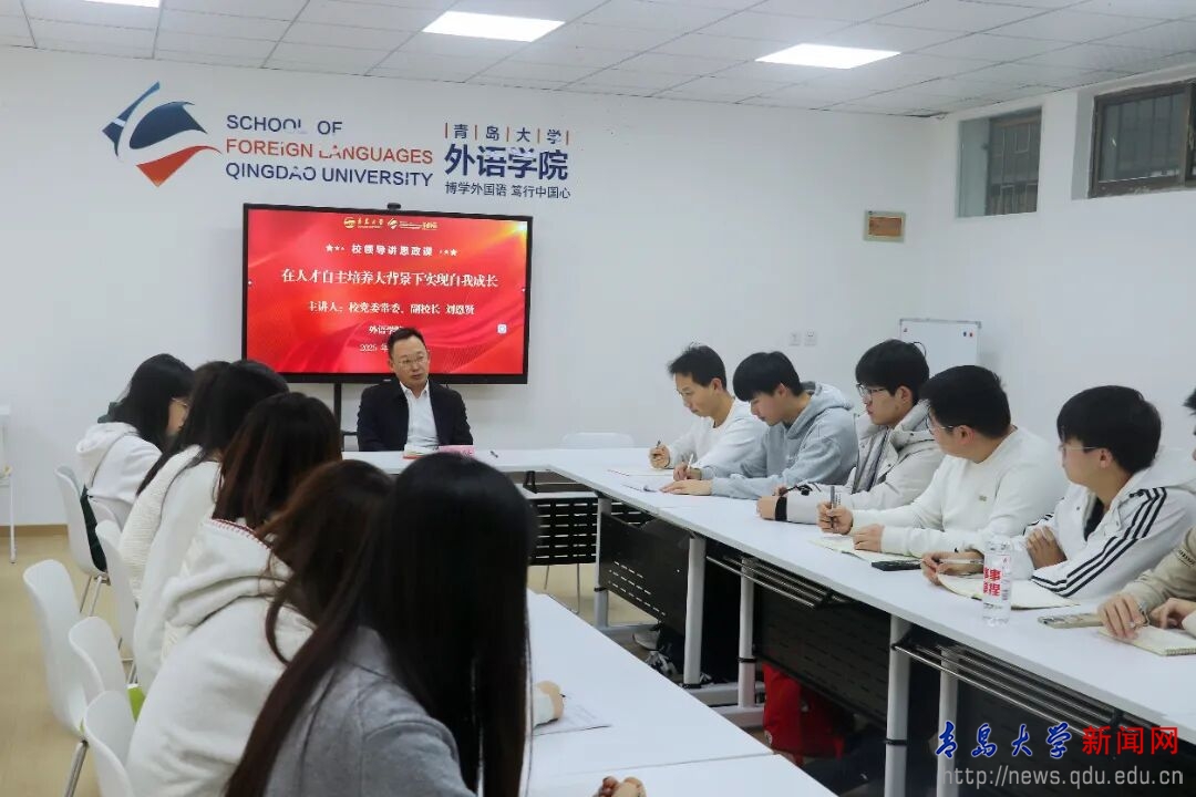 新闻网讯 12月22日下午,校党委常委、副校长刘恩贤在博文楼204会议室,为外语学院2023级英语(语言大数据)创新实验班讲授题为《在人才自主培养大背景下实现自我成长》的思政课,与学子们共同探讨中国式现代化新征程中个人事业选择与青年一代的责任担当。外语学院院长卞建华、党委副书记于苗、2023级辅导员夏淼一同听课,活动由卞建华主持。