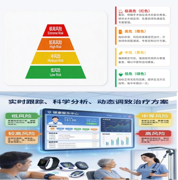 中心创新推出心血管健康风险四级分级管理体系,采用“绿色低危、黄色中危、橙色高危、红色极高危”四色标识,对居民实施精细化分层管理:低危人群以健康生活方式指导为主,每半年随访一次;中危人群需规律门诊随诊,结合中医调理与运动康复,每季度复查关键指标;高危人群开通绿色就医通道,配备专属健康管理师一对一跟踪服务,出院后纳入重点管理名单;极高危人群则启动全天候健康监测机制,开通抢救绿色通道,制定个性化康复计划,实施全程闭环管理。