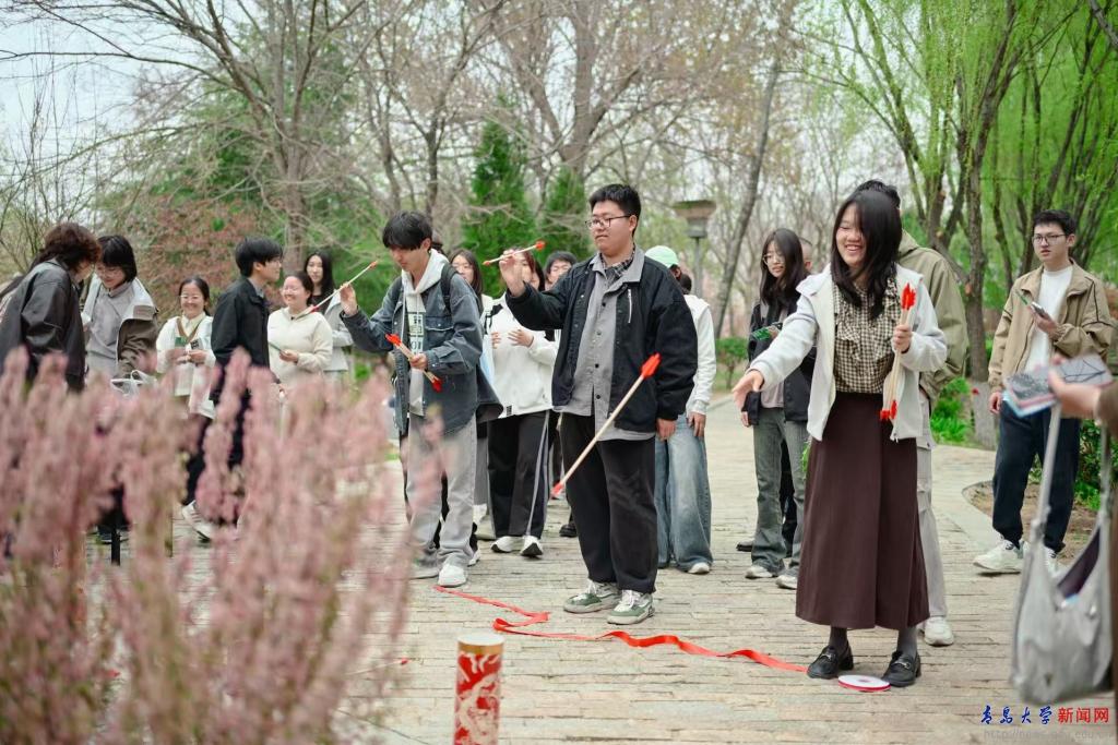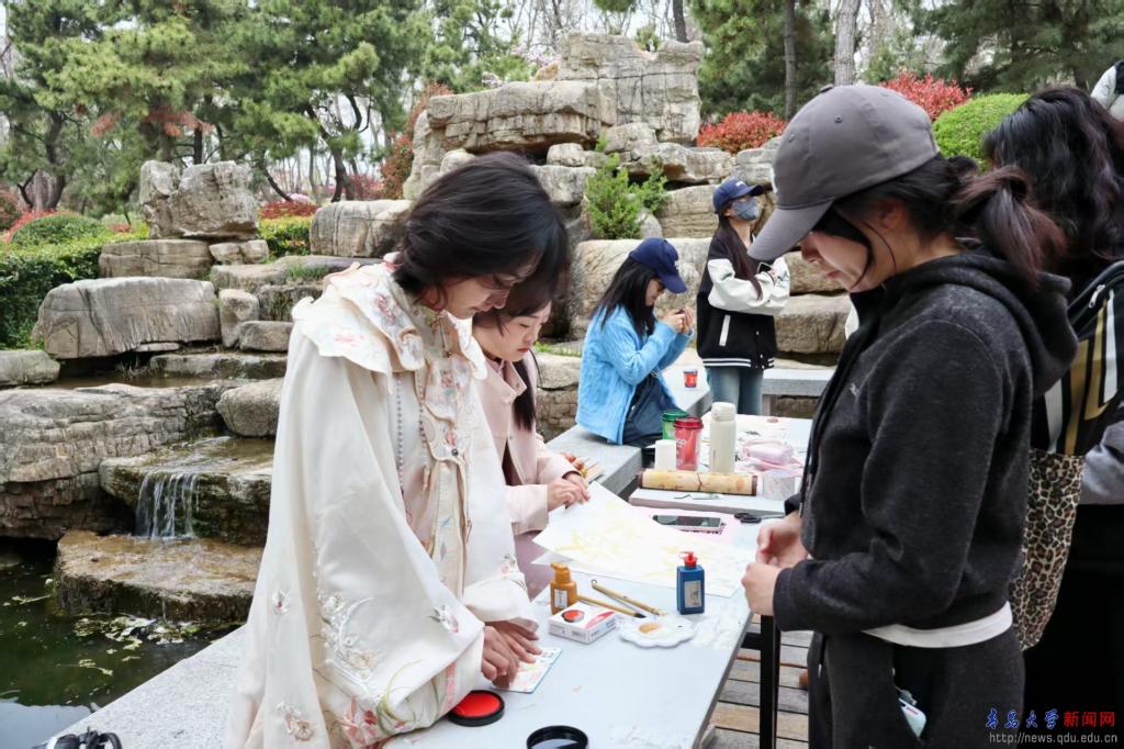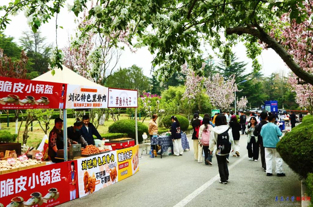 活动还设置花朝市集。面点摊位吸引了不少学生驻足,各式面食造型精巧、香气诱人,让大家在游园赏春之际,品尝到专属花朝节的温暖与心意;糖球摊位上,一串串花样糖球晶莹剔透、甜香诱人;还有茶艺摊位,让同学们深入了解茶艺文化,品鉴崂山绿茶,静心感受中式茶道的雅致与宁静。此外,花钿体验、投壶等摊位人气火爆,同学们在此感受古人宴游时的闲情逸致。