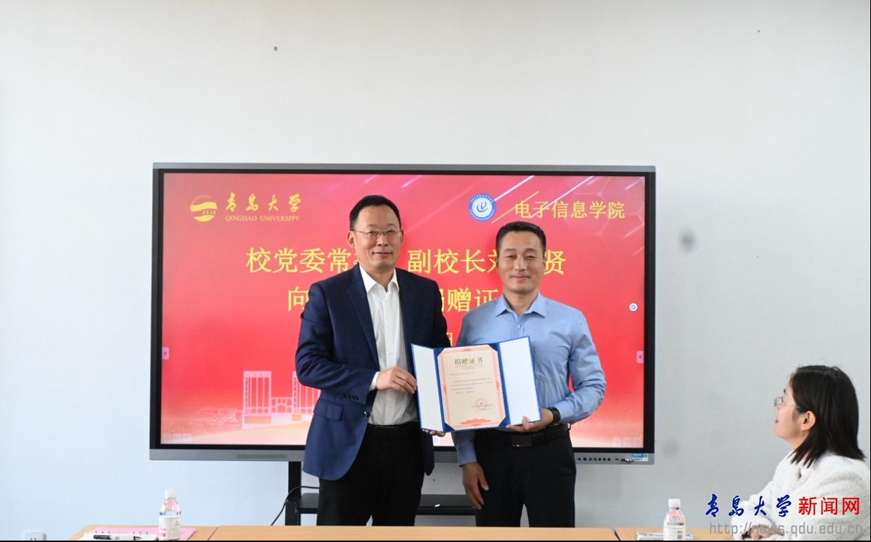 在捐赠环节,校友马玉水向青岛大学教育发展基金会捐赠湿法清洗设备一台,刘恩贤代表学校向其颁发捐赠证书。