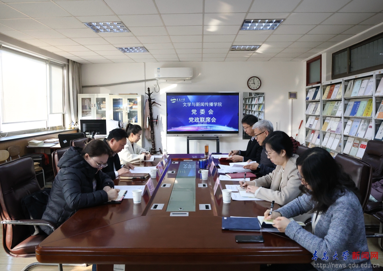 新闻网讯 12月9日上午,文学与新闻传播学院在浮山校区博文楼503会议室召开学院2025年第24次党委会和第37次党政联席会。校党委副书记陈涛列席旁听并进行指导,列席旁听工作组成员党委巡察工作领导小组办公室副主任杜一冉,党委办公室、校长办公室行政科科长李晓涵参加会议。