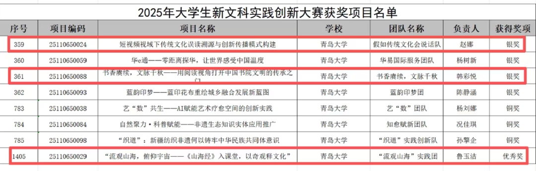 新闻网讯 近日,2025年大学生新文科实践创新大赛在陕西西安落下帷幕。文学与新闻传播学院“短视频视域下传统文化误读溯源与创新传播模式构建”项目与“书香赓续,文脉千秋——用阅读视角打开中国书院文明的传承之门”项目分别获得全国银奖,“流观山海,俯仰宇宙——《山海经》入课堂,以奇观释文化”项目获得全国优秀奖。