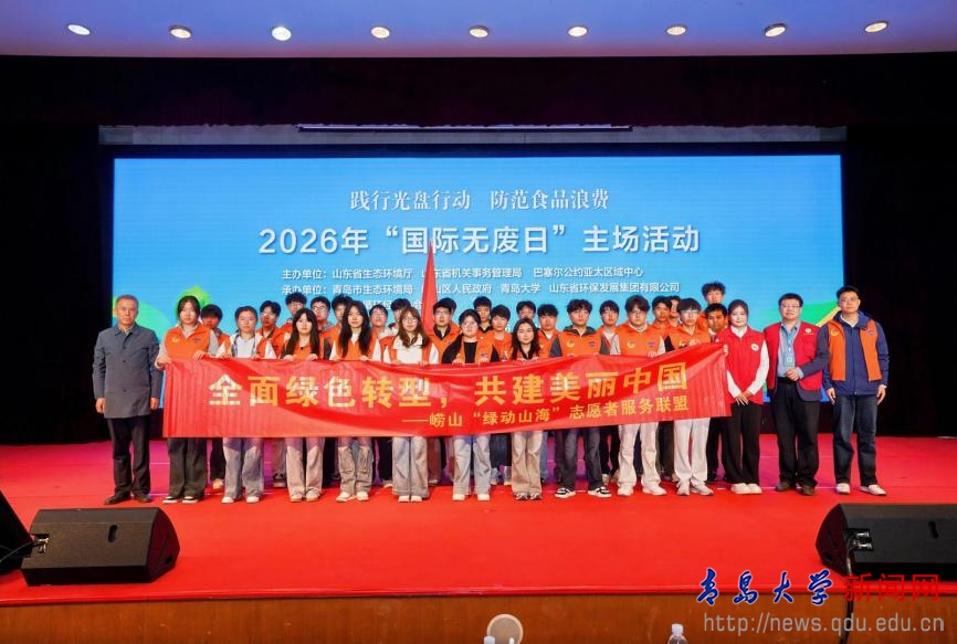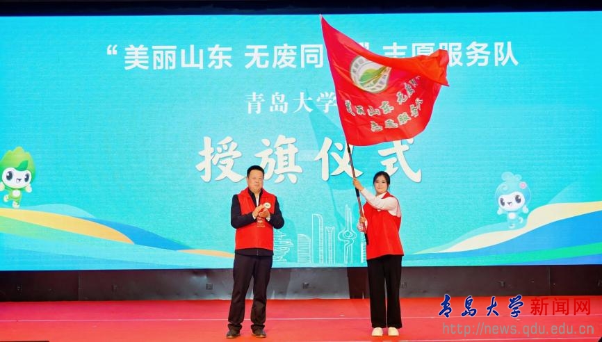 活动现场,2026年“美丽山东 无废同行”志愿服务10项活动计划正式发布。由我校环境与地理科学学院学生组建的“美丽山东 无废同行”志愿服务队青岛大学分队接受山东省生态环境厅机关党委专职副书记马运文授旗。