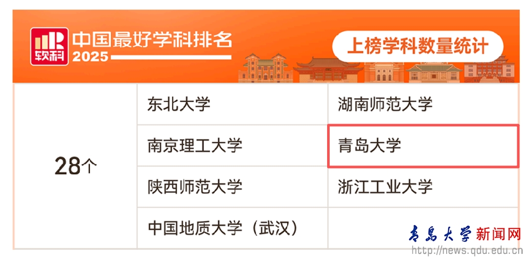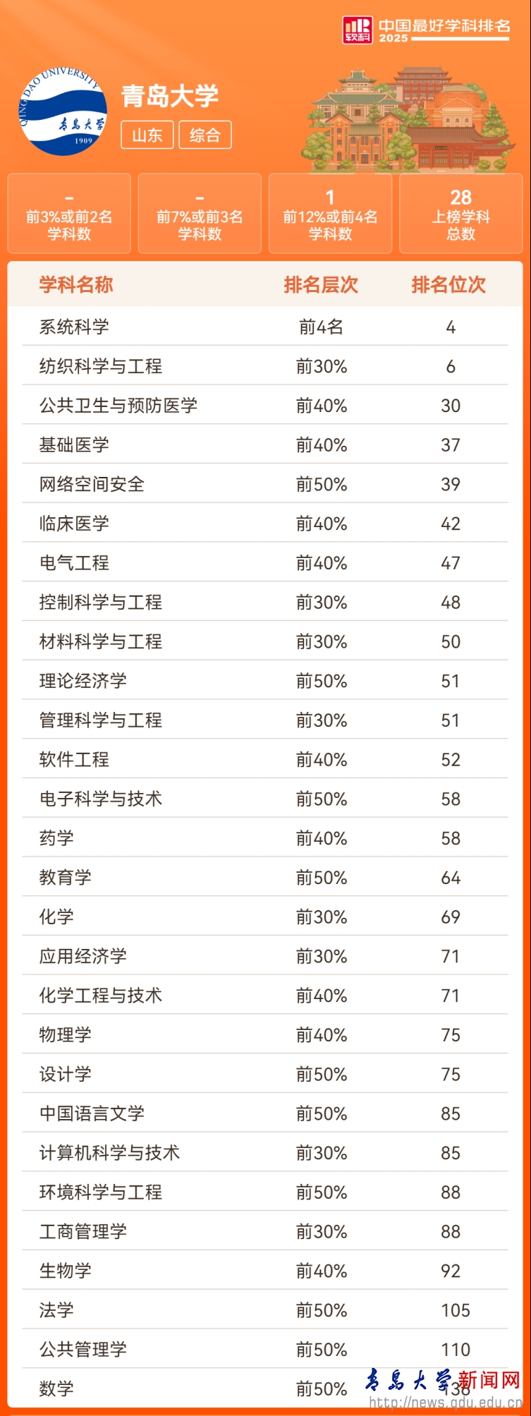 新闻网讯 10月15日,高等教育评价专业机构软科正式发布“2025软科中国最好学科排名”,我校共有28个学科上榜,上榜学科数位列全国高校第53位,省属高校首位,在非“双一流”高校中位列全国第4位。其中系统科学连续2年位列全国第4位,入选“中国一流学科”;纺织科学与工程连续4年位列全国第6位;电气工程、中国语言文学、公共管理学等3个学科新增上榜。