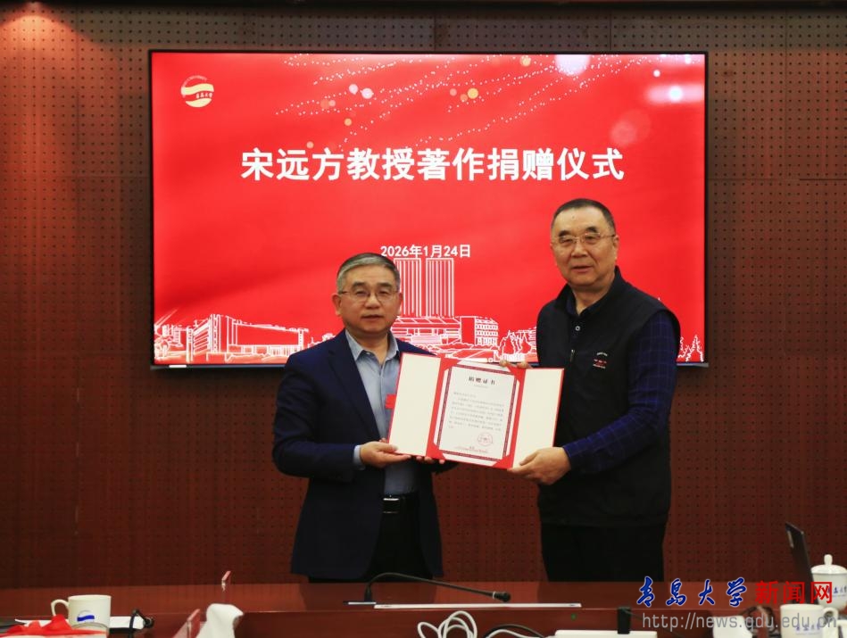 新闻网讯 1月24日下午,宋远方教授著作捐赠仪式在浮山校区办公楼201会议室举行。校党委书记胡金焱出席仪式并致辞。山东省人大常委会原副主任、青岛市人大常委会原主任、省老年人体育协会主席、青岛大学原兼职教授宋远方,校职业经理人学院院长、青岛市国资委原党委书记、主任、一级巡视员马卫刚,青岛市人大常委会原副秘书长、办公厅主任隋志强,青岛市人大常委会代表工作委员会代表建议处处长王大鹏应邀莅临。仪式由校党委常委、副校长刘恩贤主持。