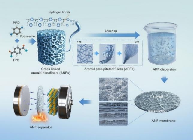 常规聚烯烃隔膜受限于材料本征特性,存在热稳定性差、机械强度不足等问题,严重制约了高安全、高能量密度锂电池的发展。芳纶纳米纤维(ANF)隔膜集耐高温、高强韧、阻燃等本征特性与纳米纤维的高纵横比、高比表面积等结构优势于一体,被视为下一代锂电池隔膜的理想材料。然而,如何实现综合性能优异的纯ANF隔膜的简单、可控制备,仍是当前该领域面临的核心挑战。