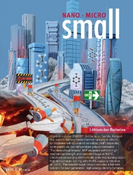新闻网讯 近日,材料科学与工程学院隋坤艳教授仿生智能材料团队在新型锂离子电池隔膜材料研究领域取得重要突破。相关成果以“Robust, High-Temperature-Resistant Aramid Nanofiber Separator with Hierarchical Structure for High Performance Lithium-Ion Batteries”为题,发表于纳米材料领域国际顶级期刊 Small(IF=12.1),并被遴选为封面扉页亮点论文。论文第一作者为材料学院2022级硕士研究生刘金磊,通讯作者为隋坤艳教授、李思成副教授以及巢湖学院马涛副教授。