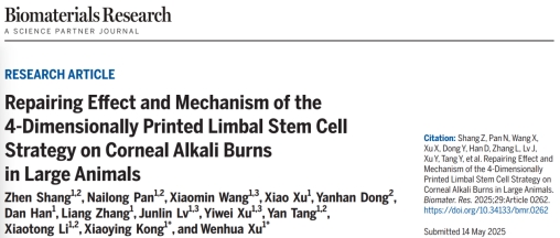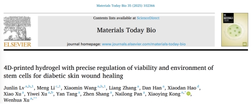 新闻网讯 近日,再生医学与检验创新研究院徐文华教授团队连续在国际权威期刊Materials Today Bio(IF:10.2)和Biomaterials Research(IF:9.6)在线发表题为“4D-printed hydrogelwith precise regulation of viability and environment of stem cells for diabetic skin wound healing”和题为“Repairing effect and mechanism of 4D-printed limbal stem cells strategy on corneal alkali burns in large animals”的两篇研究论文。