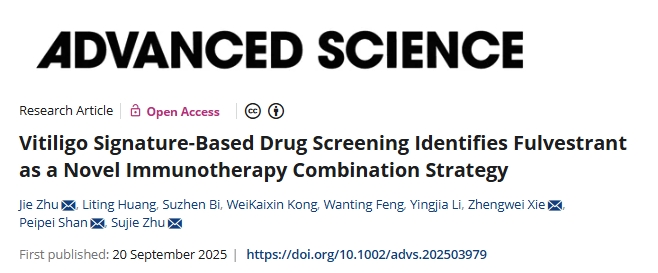新闻网讯 近日,我校转化医学研究院朱素杰教授、单佩佩副教授研究团队联合北京大学谢正伟教授团队在 Advanced Science 杂志在线发表题为“Vitiligo Signature-Based Drug Screening Identifies Fulvestrant as a Novel Immunotherapy Combination Strategy”的研究论文。朱杰、黄丽婷、毕素贞、孔维恺忻为本文的第一作者,朱素杰教授、单佩佩副教授、谢正伟教授、朱杰博士为本文通讯作者。青岛大学附属医院为第一单位和通讯单位。本研究得到了国家自然科学基金、山东省青创团队等项目的资助。