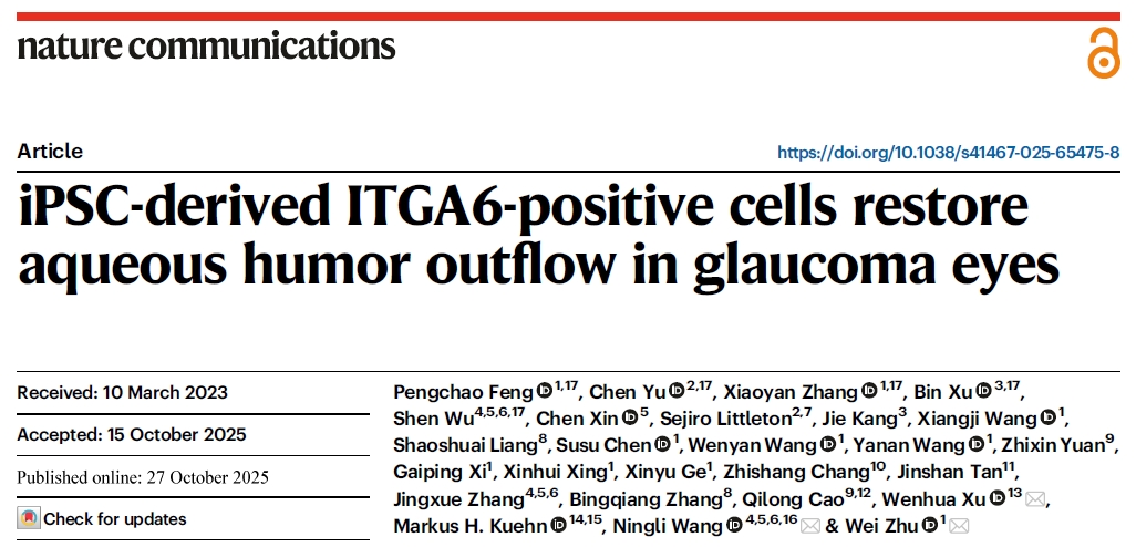 新闻网讯 近日,我校药学院朱玮教授联合首都医科大学附属北京同仁医院王宁利教授、青岛大学徐文华教授,以及美国爱荷华大学、杜克大学等单位,在国际知名期刊 Nature Communications 上发表题为“iPSC-derived ITGA6-positive cells restore aqueous humor outflow in glaucoma eyes”的研究论文。该研究揭示了iPSC来源的ITGA6⁺细胞通过menRNA介导的跨细胞表观遗传机制,促进小梁网组织再生并降低眼压,为青光眼治疗提供新思路。药学院2024级博士生封鹏超和张晓燕、美国杜克大学Chen Yu博士、中国海洋大学徐彬副教授和首都医科大学附属北京同仁医院武珅助理研究员为本文的第一作者。青岛大学为第一单位和通讯单位。