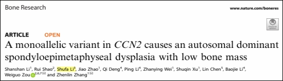 新闻网讯 青大附院内分泌与代谢性疾病科平度病区李树法教授于2024年10月在国际权威学术期刊 《Bone Research》(影响因子 15.0)发表题为“A monoallelic variant in CCN2 causes an autosomal dominant spondyloepimetaphyseal dysplasia with low bone mass” 的研究论文。该研究首次发现CCN2基因单等位基因变异可导致一种常染色体显性椎-骺-干骺端发育不良(SEMD),CCN2为新发致病基因,该病患者儿童期可出现摇摆步态、关节活动受限、下肢相对较短的矮身材,部分在青年期即出现类似骨关节炎的关节退变,成年期合并低骨量/骨质疏松,填补了 CCN2 缺陷相关人类表型长期空白。日前,该研究成果正式被“在线人类孟德尔遗传数据库(OMIM)”收录,论文前三位作者 Li Shanshan、Shao Rui 、Li Shufa(李树法)的姓氏被用于该疾病的诊断分型命名即“Li-Shao-Li型脊柱骨干骺端发育不良(Spondyloepimetaphyseal dysplasia, Li-Shao-Li type)”。人类医学史上以中国人姓名命名疾病不多,这一命名充分肯定了中国学者在遗传性骨骼发育不良分型领域的原创性贡献,也提升了我国在该研究方向上的国际话语权。