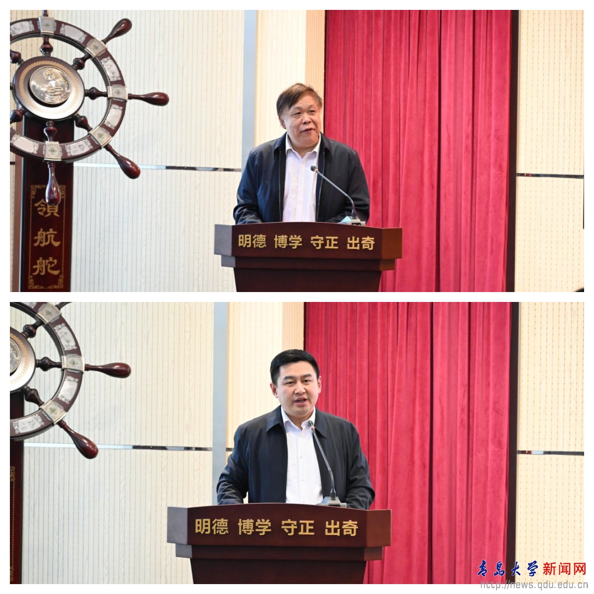 菏泽市委组织部副部长、市招才引智服务中心主任孙飞介绍了菏泽的文化底蕴、经济实力、汉服产业及人才政策,重点阐述了“一县区一高校”校地合作成果与多元人才政策,并诚挚邀请青岛大学师生赴菏泽交流合作,共同为传统文化传承与地方高质量发展注入新动能。