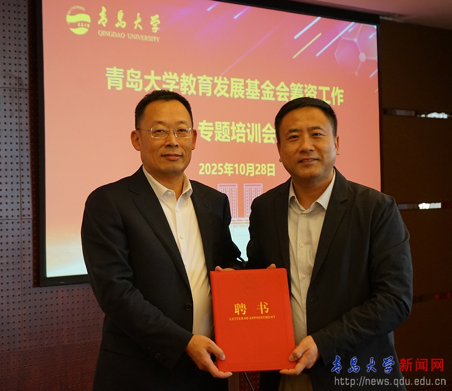 培训会后,刘恩贤为杨维东颁发青岛大学教育发展基金会顾问聘书。