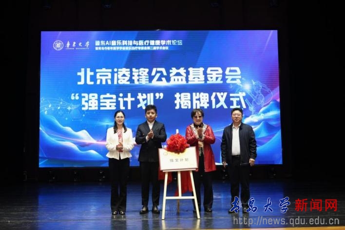 开幕式上,北京凌锋公益基金会“强宝计划”项目正式启动。青岛鲸语岛科技有限公司无偿捐赠资金作为启动资金,后续将持续捐赠。捐赠资金主要为贫困个体及家庭提供医疗救助,助力青岛大学青岛医学院等高校开展音乐治疗临床研究与实践。项目地点设在青岛医学院音乐治疗研究中心。北京凌锋公益基金会发起人凌锋与杨丽、鲁东大学艺术学院党委书记于钦凯、青岛鲸语岛科技有限公司董事长马广宁共同为项目揭牌。