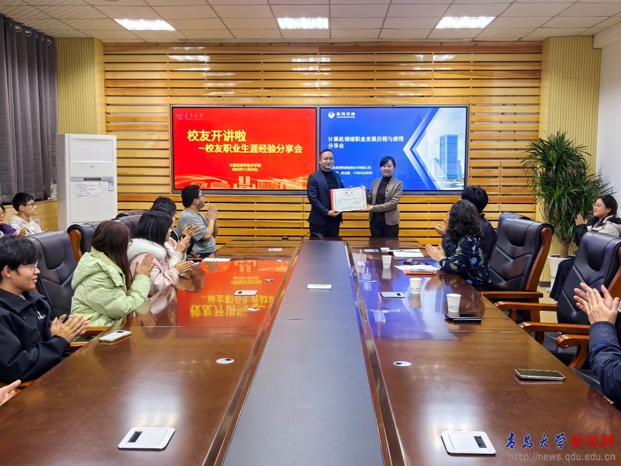 新闻网讯 11月25日,计算机科学技术学院在博知楼510会议室举办“校友开讲啦”职业生涯经验分享会。活动特邀青岛蓝海软通信息技术有限公司总经理、学院校友姚志鹏主讲,围绕“计算机领域职业发展历程与感悟”展开深度分享。